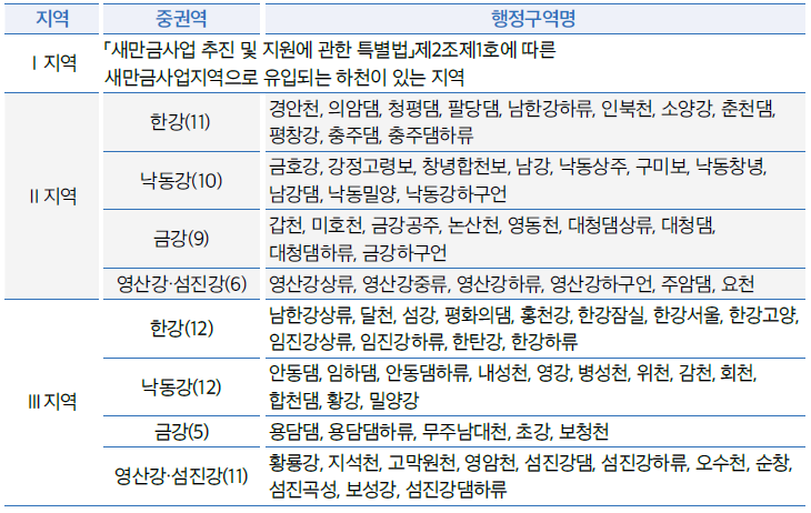 방류수수질기준은 공공수역에 방류되는 방류수에 대한 기준이므로 중권역에 따라 3개의 지역으로 나뉩니다.
